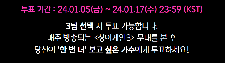 이번 마지막 투표기간은 싱어게인3 11화 방송 종료 시점부터 결승전 방송 종료 직전인, 1월 17일 (목) 밤 11시 59분까지입니다. 잊지 않기 위해 알람 설정이라도 해서 매일 소중한 권리를 행사하시길 바래요. 여러분의 소중한 한 표가 싱어게인3 우승자를 바꿀 수 있습니다.