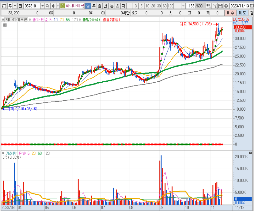 11월 10일 기준으로 하나마이크론의 종가는 33,200원으로 기록되었습니다. 이는 전일 대비 5.23% 상승한 가격이에요. 투심이 얼어붙은 시장상황에서도 거래량이 5,956,702주로, 전일대보 262.17%나 증가했네요.