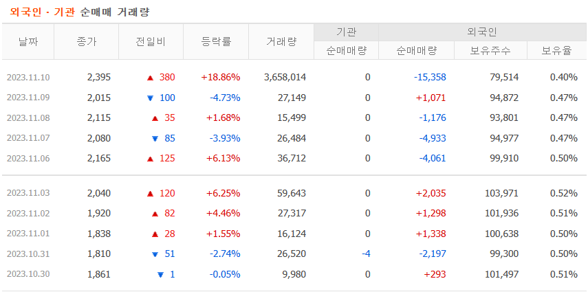 -2023년 6월 전년동기 대비 별도기준 매출액은 55.8% 감소, 영업손실은 116.6% 증가, 당기순손실은 402.1% 증가. 중국 정부의 환경규제 강화와 COVID-19에 따른 공급불안정으로 매출이 크게 감소하였음. 비용 절감에도 수익성은 하락세를 지속중임. 22년 2분기부터는 반도체 소재 중간체와 2차전지 전해액 첨가제 중간체를 공급하기 시작하여 매출이 발생하고 있음.주식 시장에서 세 가지 매수 주체는 외국인, 기관 그리고 개인입니다. 여기서 가장 큰 매수 세력은 개인 투자자입니다. 각각의 투자 방식이 맞지 않아 개인 투자자는 큰 매수 주체임과 동시에 주식에서 가장 약한 세력입니다. 집중되지 않은 투자 전략으로는 기관 투자자나 외국인 투자자에게 이길 수 없었던 것입니다.